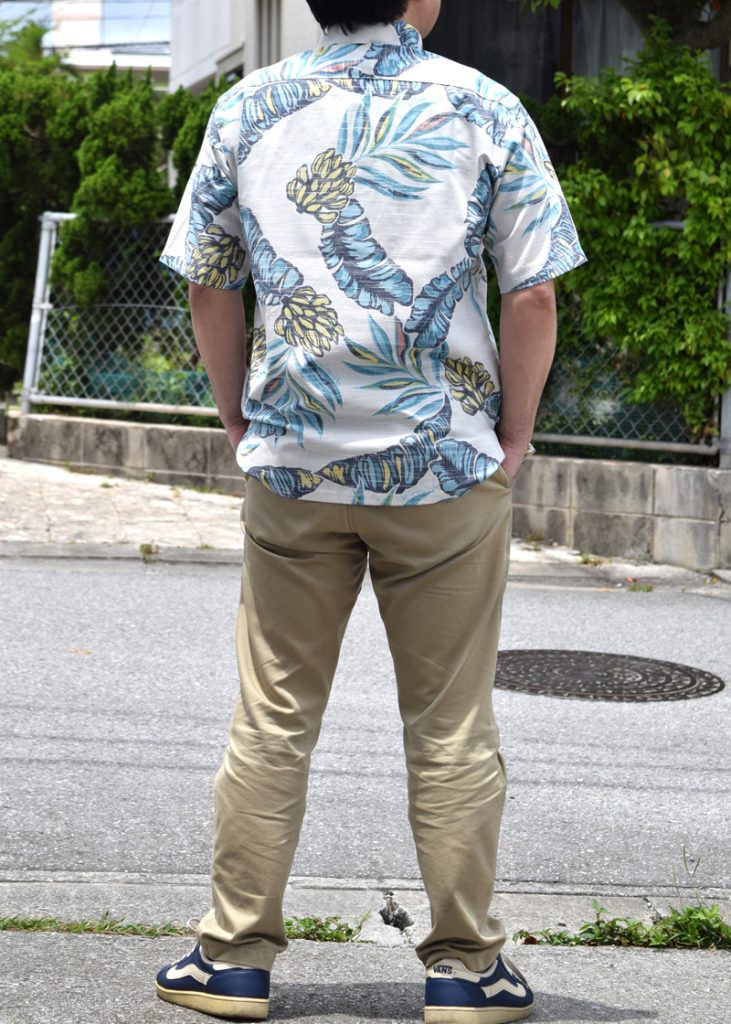 こちらはメンズ限定デザイン。私の中の、なぜレディースシャツが無いんだ!と思うシャツのひとつです。だから父に着て欲しい!紅型ちゅらシーサーとはうって変わって、こちらも裏地特有のかすれ感がありますが、こちらは男らしく力強い島バナナの柄をぐっと引き立てる役割をしています。特に葉の黒くて手書き感溢れる輪郭が凛々しくていい。