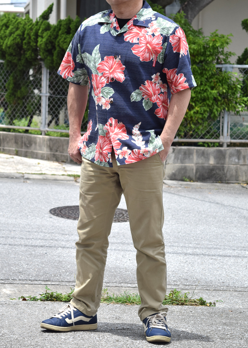 大柄の鮮やかなハイビスカスがどんなシーンでも上品に映える一着。お色も豊富で5色あるんですが、白地を着るほどさわやかじゃないし(男らしいからってコトね!)、ライトブルーほど若くないし、赤ほどアロハ着慣れてないし…やっぱり落ち着いていて締まりのあるネイビーがいい!