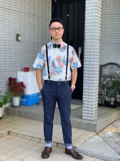 新作の紅型クイナ(ボタンダウン/ネイビー)を着用。