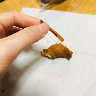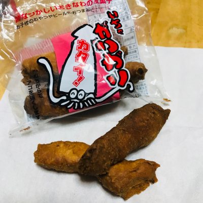 この大きさの中に、このサイズのスルメが!!私はいちゃがりがり大好きでよく買いますが、未だにちょっと(スルメいる…?)と思ってしまいます。これはお土産にあげると、①「なんやこれ!!」②「なんでやねん!!」のコンボで大ウケ間違いなしです。実際、父が県外の方へのお土産に持って行ったら大ウケだったそうです。
