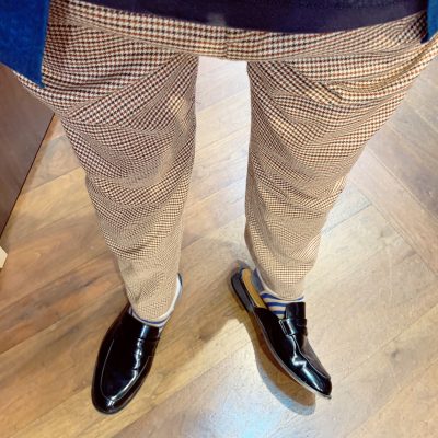 千鳥柄のパンツとスリッパ風の革靴を使ってみました♪
