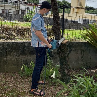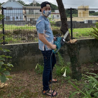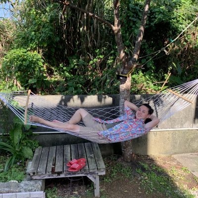↑芝生の植え付け、バラスの配置、花壇を耕したあとハンモックで休憩をとるイシキ。