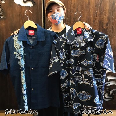 「おじいちゃんは営業のお仕事をしているから、仕事でも着れるかっこいいネイビーがいい!和クアリウムは、かわいい魚柄で話題性あるから営業のお仕事にはいいかな♪ん~でも、ここはかっちりした紅型デイゴブーゲンでシックにがいいかな…選べない~!!」