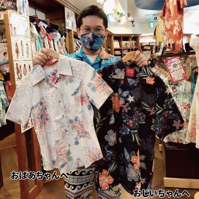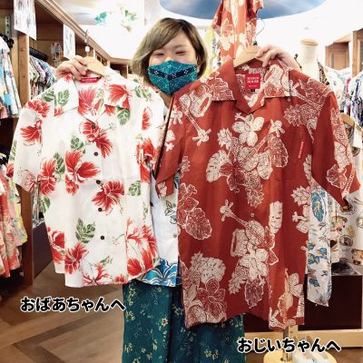 おじいちゃんには、【ドラゴンハイビー】、おばあちゃんには【サンサントロピカル/チュニックシャツ】