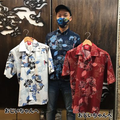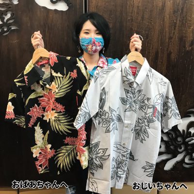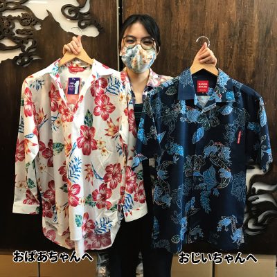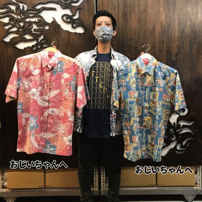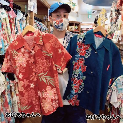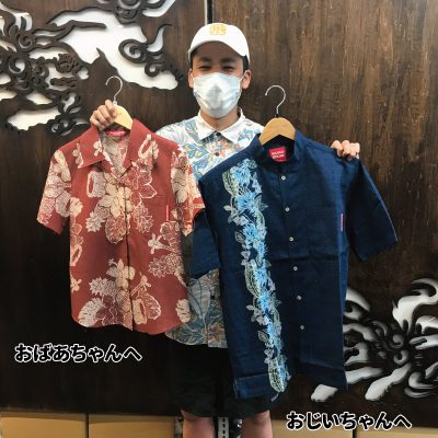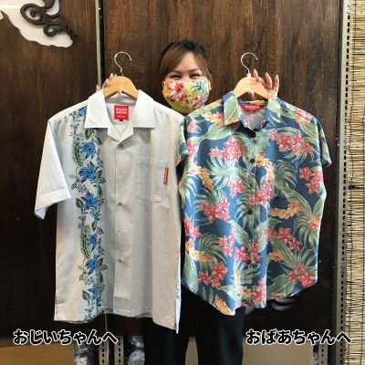 おじいちゃんには【紅型デイゴブーゲン】、おばあちゃんには【プルメリアガーデン/カシュクールシャツ】