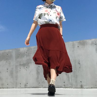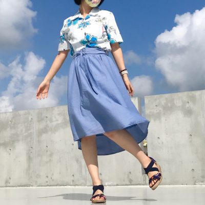 オキナワンハイビーのアイボリーに、さらっと素材で丈がアシンメトリーになっているオシャンなスカートに、ローファー。清楚コーデのつもりです。