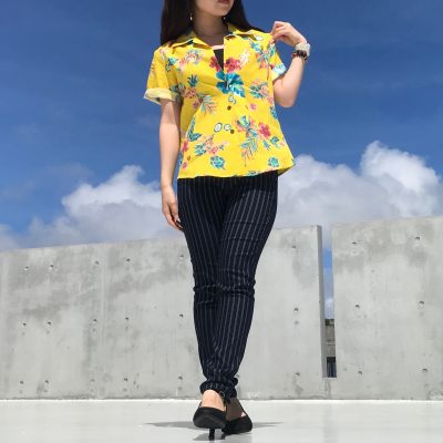 コンサバというコーデにも興味はあるんですが、ちょっと照れちゃう!ので、かりゆしウェアは黄色で元気いっぱいのシーサーパラダイスに、紺のストライプスキニーパンツに、黒パンプス。