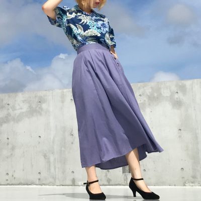 グレイスハイビーのネイビーに、薄紫のロングスカート。最近流行りのウエストが太めできゅっと細く見えるスカートですごく大人っぽかったので、黒パンプスと合わせて大人コーデ。