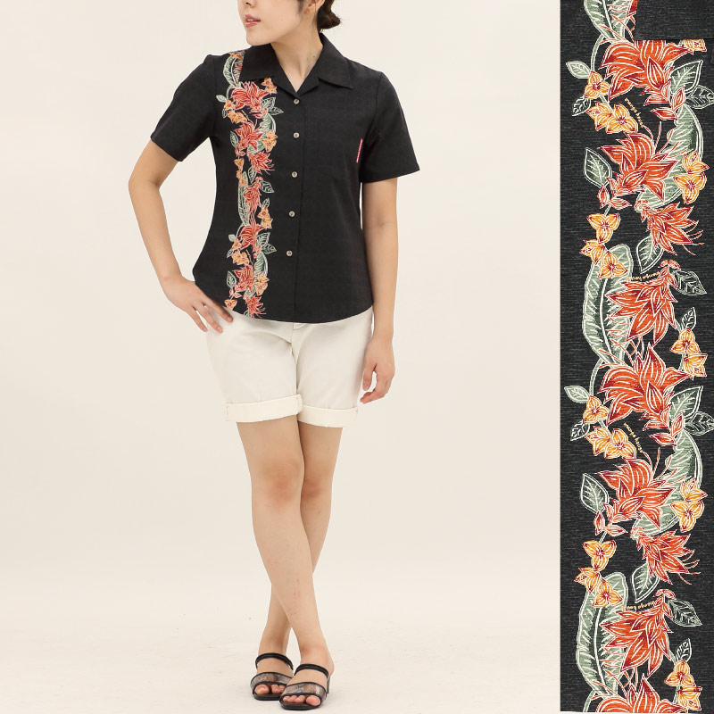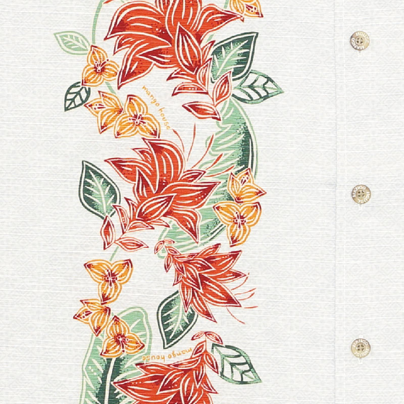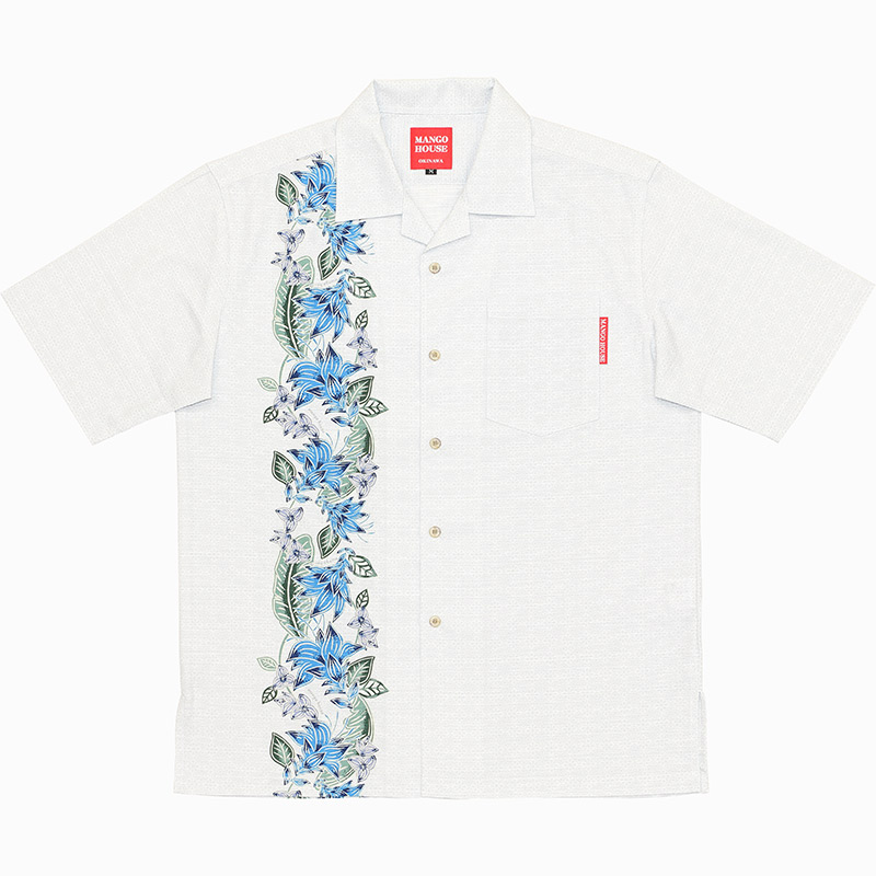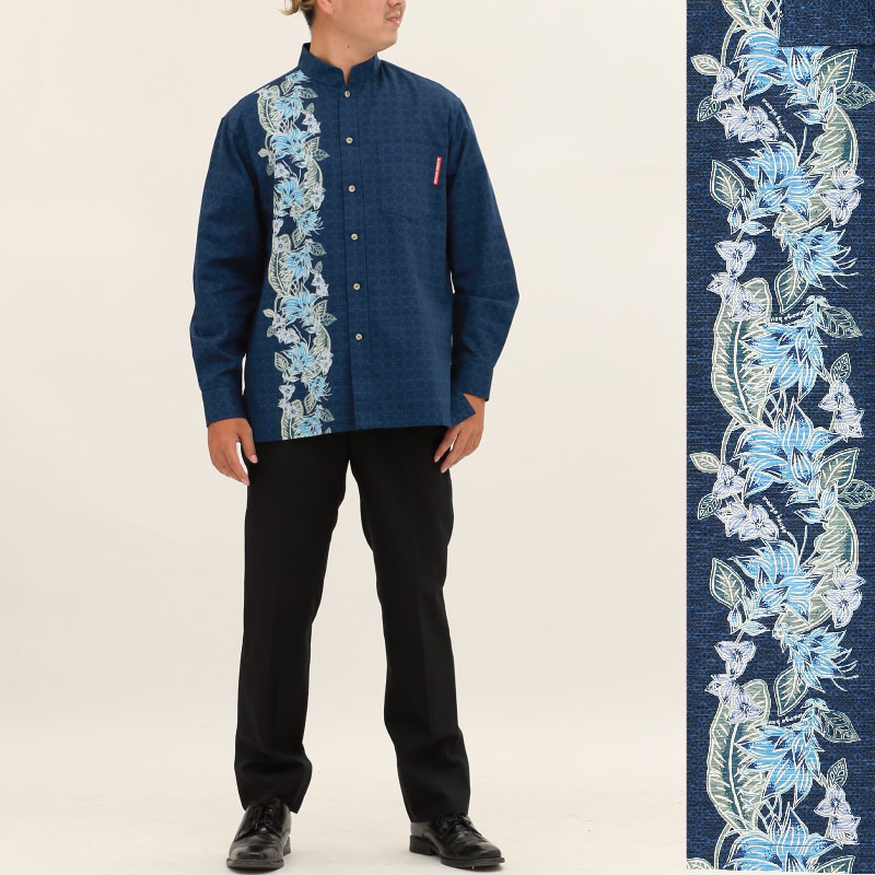 でもこちらは色数は抑えてもっと派手さを無くし、タッチは紅型調として表現したので、かりゆしウェアとして、どんなシーンでも着やすいシャツにしました♪