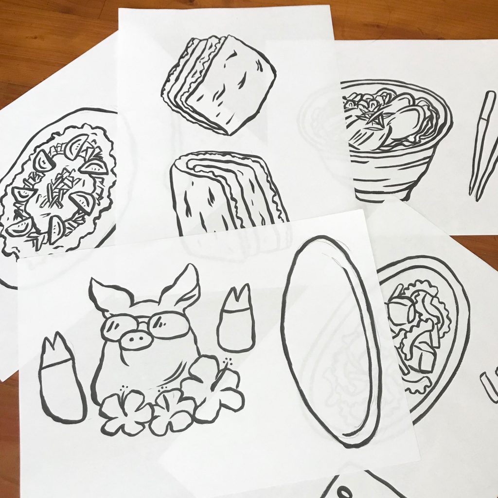 沖縄料理なので昼食や夕飯の事を考えながら描いていました。なのでデザイン中はうわの空だったんです。HAHAHAHAでもこの適当なゆるい線が、いい味出してますよね~。