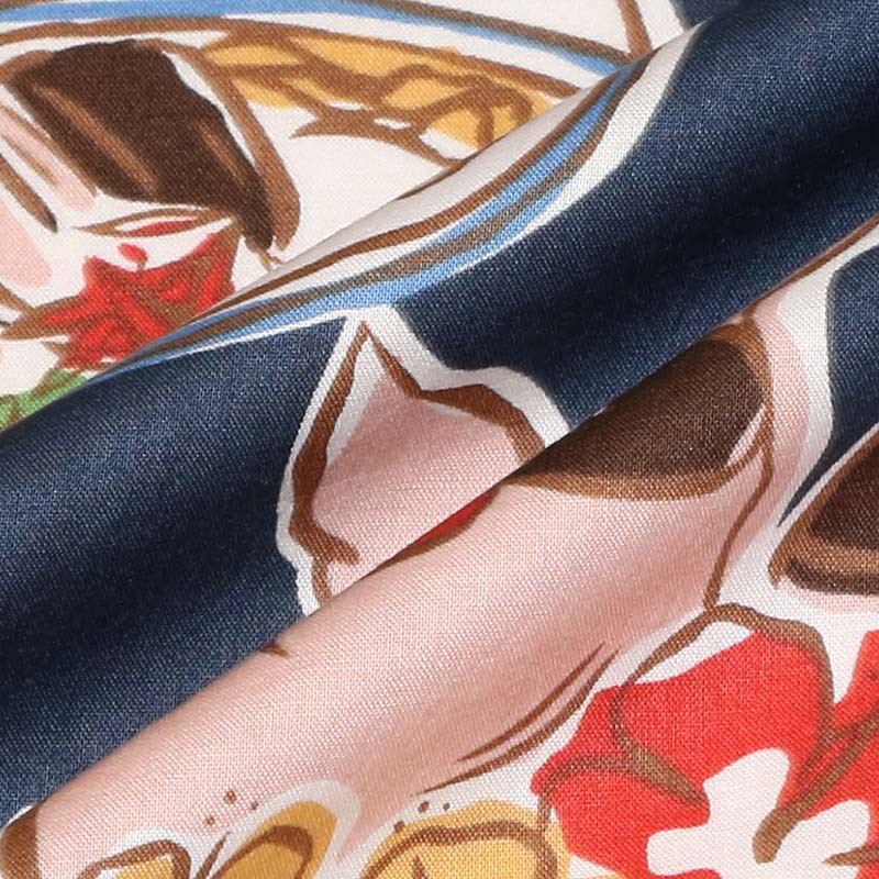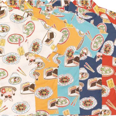 薄い生地で涼しいですが、光沢のある平織なので、料理柄に若干の「シズル感(広告や写真の界隈では、食べ物の瑞々しさ、という意味で使われます♪)」が出ています。