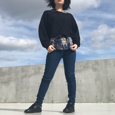 夕日に照らされわかりにくいですが、薄い緑色のスカートを着ています。それに黒い靴を履いています。なら絶対これ!と思いプルメリアガーデンカシュクールシャツのブラックに。