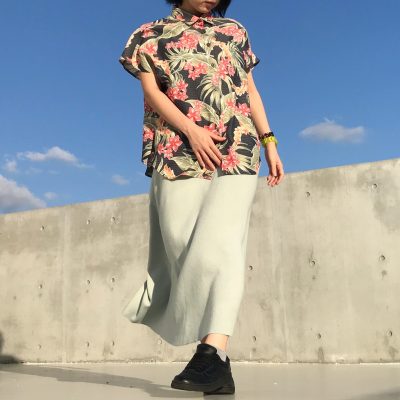 この日はお休みでした。特に出かけませんが、天気が良かったので手持ちのかりゆしウェアと服でやった事ないコーデをしてみようと。