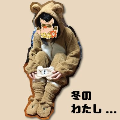 もはや着ぐるみを着なければいけないほどに寒がりです。嘘と思いますが、本当です。着ぐるみの下にはトレーナー上下、上は2枚着ています。寝る時には、この部屋着+毛布と布団合わせて3枚かぶって寝ます。