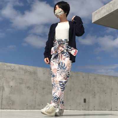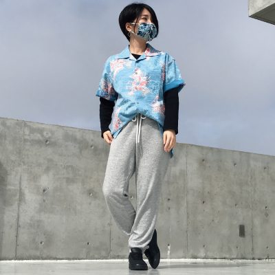 動きやすくカジュアルなコーデも好きなので、メンズライクなグレーのスウェットパンツに合わせて【紅型クイナ】のライトブルー。