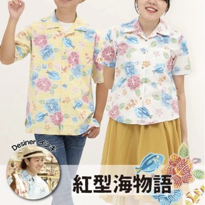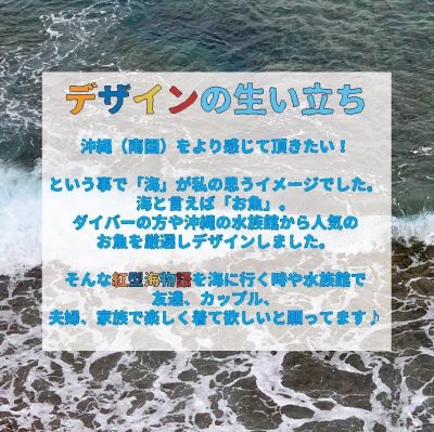 ゆったりとした沖縄の海を紅型調で南国ならではの「ハイビスカス🌺」、「カクレクマノミ🐟」、「ナンヨウハギ🐠」をカラフルに彩り、着て楽しくなるような物語を共に創って欲しいと言う思いがこもったデザインとなっております。