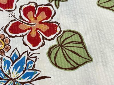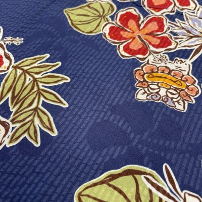 ちょっと地味~。【ぶぎうぎアイランド】の面影ほぼないですよね!ゆうなと月下美人とブーゲンビレアの柄、生地は綿&ポリエステル混紡で裏地仕様として使われるシーチング生地にしようと考えていました。