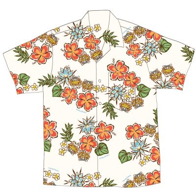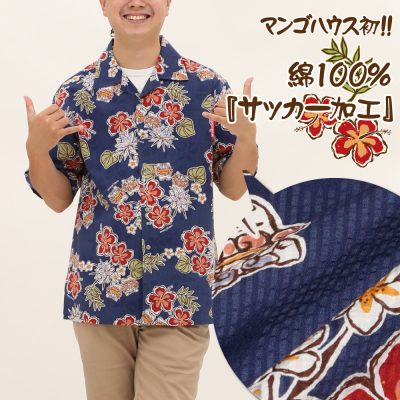 はいた~い!昨年2020年に入荷した商品ですが、ちょ~おかわいいシーサー柄、それもマンゴハウス初「サッカー加工生地」のかりゆしウェア【ぶぎうぎアイランド】