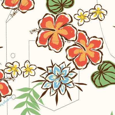 まず、この柄の中で月下美人は上手く描けているけど、ゆうなはカタツムリみたいだし、ブーゲンビレアもちょっと渋いな~ということで、ゆうなはハイビスカスに、ブーゲンビレアはプルメリアに変えて南国感満載のお花を選びました。