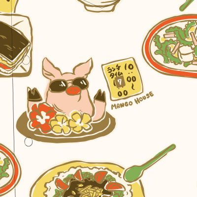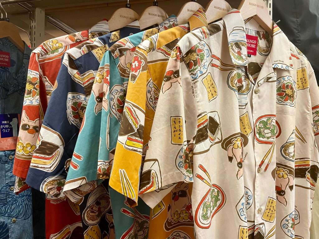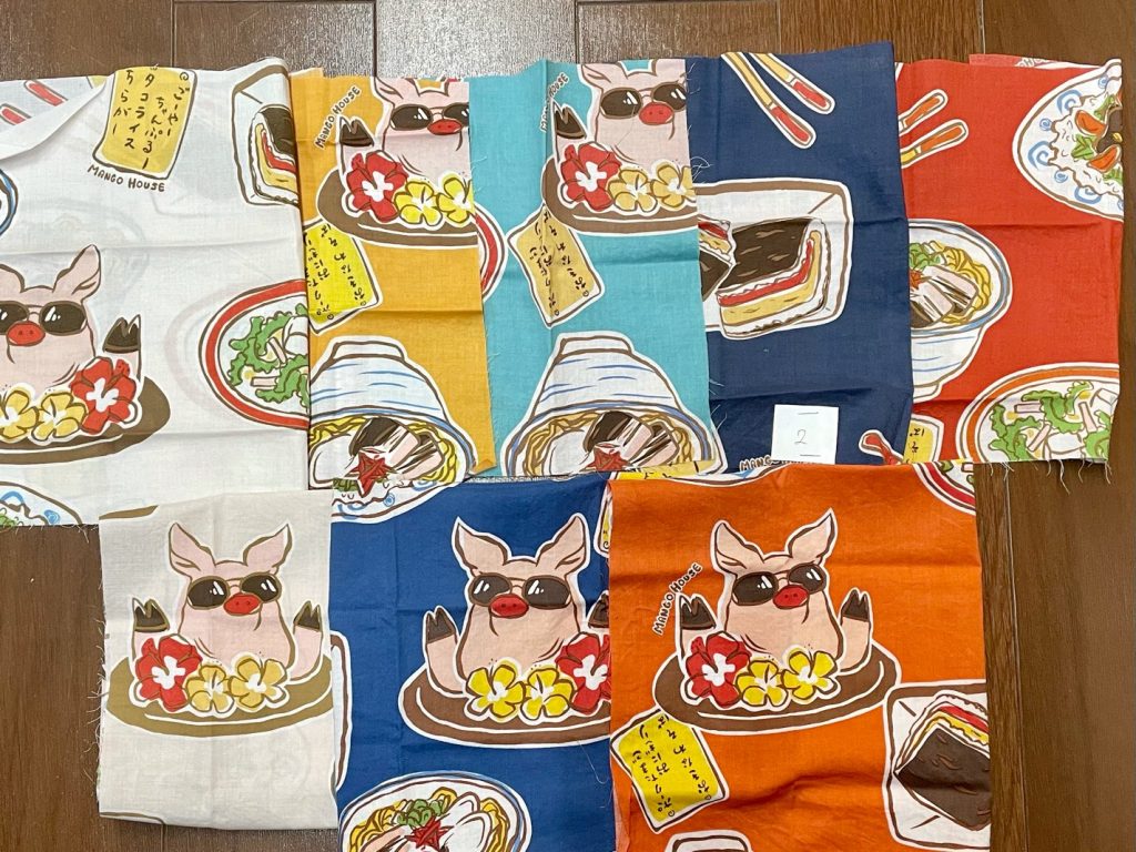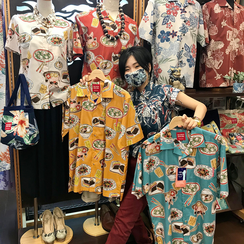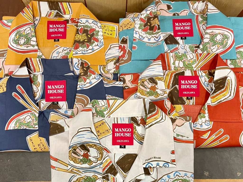 (ちょっと心配だった)と言いましたが、今では私の自信作のひとつ。大好きなので、ご来店頂いたお客様にはす~ぐ「これ!私がデザインしました!!」というクセがつきました。どこかのかりゆしウェア屋で沖縄料理の柄を描いたねーちゃんがいた覚えがあったら、それはマンゴハウスのきんじょうです。