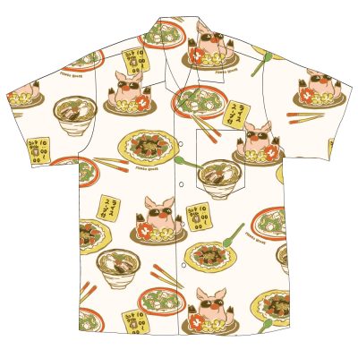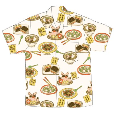 【うちなーごはん】~HAHAHAHAHAHAHA!!!おもしろい笑笑なんと沖縄料理柄かりゆしウェア。テーマは「なんでやねん」です。