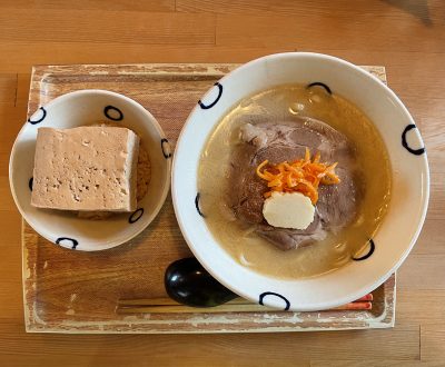 島豆(しまとう)飯🍚というさんぴん茶で炊いたお米の上にじっくり煮込んだ大きい島豆腐と真味は、白湯スープで仕上げられにんじんのナムル(にんじんしりしり風)が乗った沖縄そばでした😋