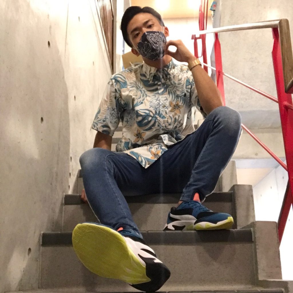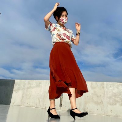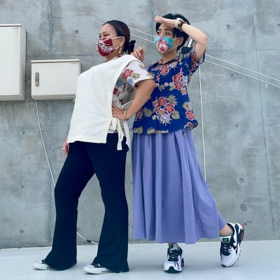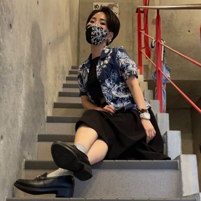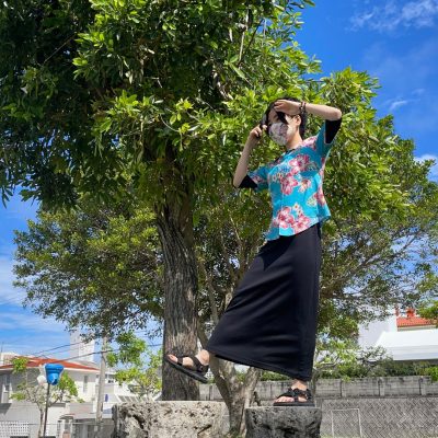 全身黒なので輝く感じのかりゆしウェアを合わせてとがりたいな~と(笑)トップスもスカートもシンプルなものですがゆめみオアシスのネイビーと単色月下美人のブラックのマスクで印象が強くなりました。