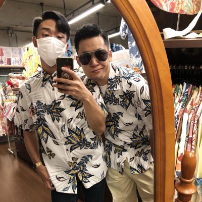 staffきんじょうと、たまたまかぶった【紅型デイゴブーゲン】。メンズもレディースもかっこいい。