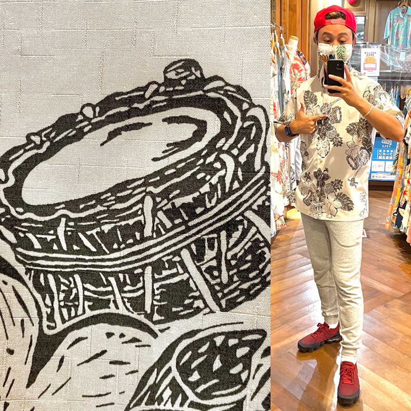 ハイビスカスやモンステラ、三線、パイナップル、締め太鼓が名の通り木彫り(版画)風にデザインされた色合いがシンプルな一着で、メンズ長袖ボタンダウンシャツやメンズ開襟シャツ、レディース開襟シャツもございます❣️