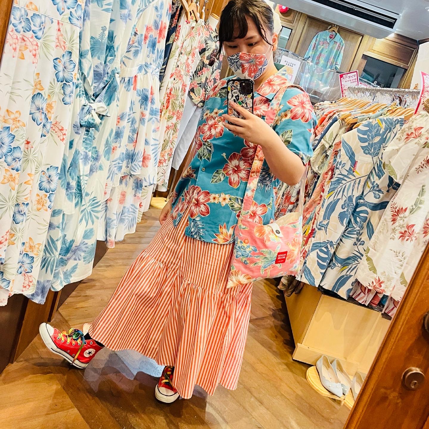 ストライプ柄のスカートと、かりゆしウェアを合わせてみました♪