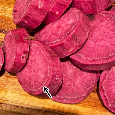 そして、皮をむいた紅芋を切っていると、、、
