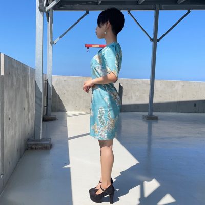 立体裁断でウエストのみ細く作られたデザインなので立ち姿がとにかく上品。リゾートドレスのようなふわっと感が無いので華やかに目立つというよりは小さく凛と光るイメージ。