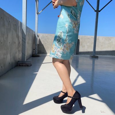 私は膝上部分、太ももが気になるのとヒップの位置が高くないので高いヒールを履いて、足長効果と下半身をより綺麗に見せられるようにしてみました。