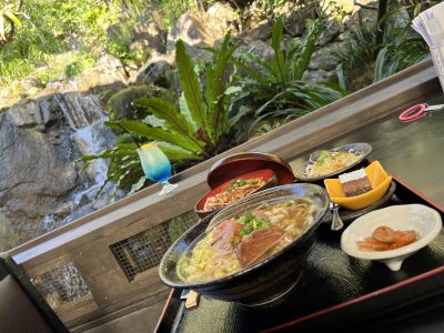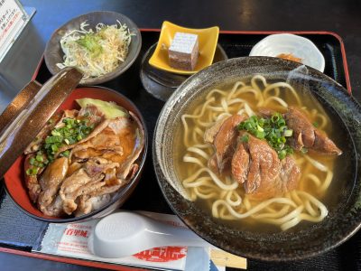 そして待ちに待ったお食事。たくさん美味しそうなメニューがあり迷いましたが、僕は〝あぐーの肉そば〟〝あぐーの生姜焼き丼〟などがいただける「あぐーの贅沢御膳」に。せっかくだったので名前の通り、ここは贅沢にいかせて頂きました。