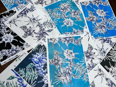 この光景をぜひかりゆしウェアで表現したくって、モチーフは沖縄の県花デイゴと、夜にしか咲かない月下美人をモチーフに描きました。