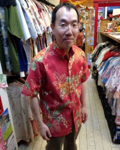 かりゆしウェアはディスプレイしていた今年の新作の【紅型デイゴ】を気に入っていただいて、ご購入されました。