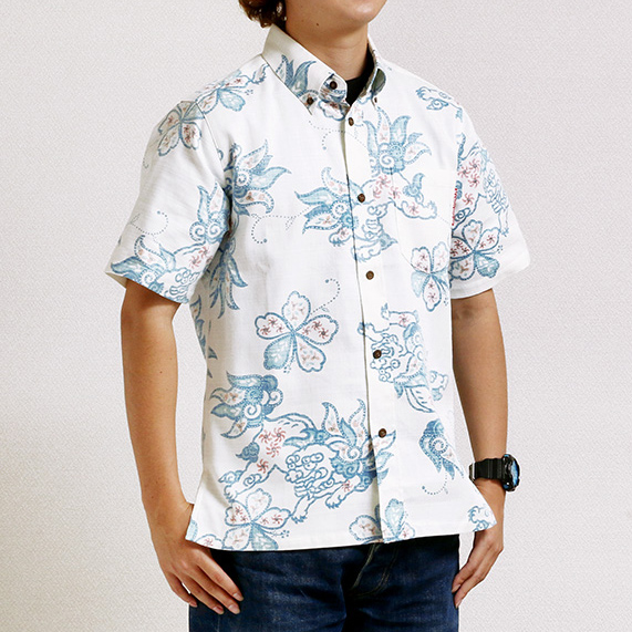 アロハシャツ-かりゆしウェア【シーサーペイズリー(スリムフィット/ボタンダウンシャツ)裏地仕様 メンズ】