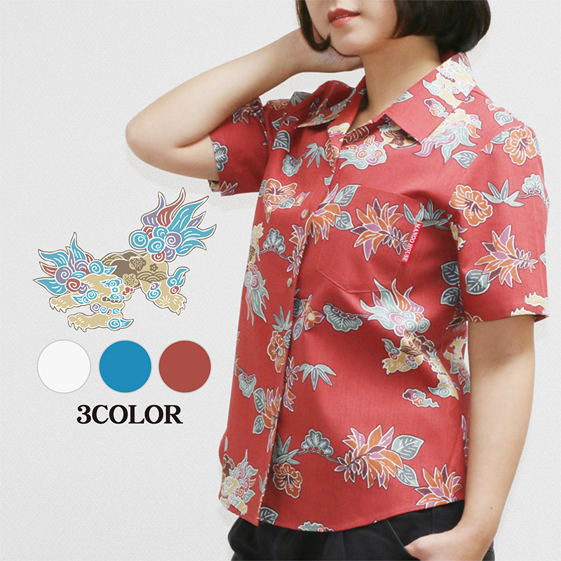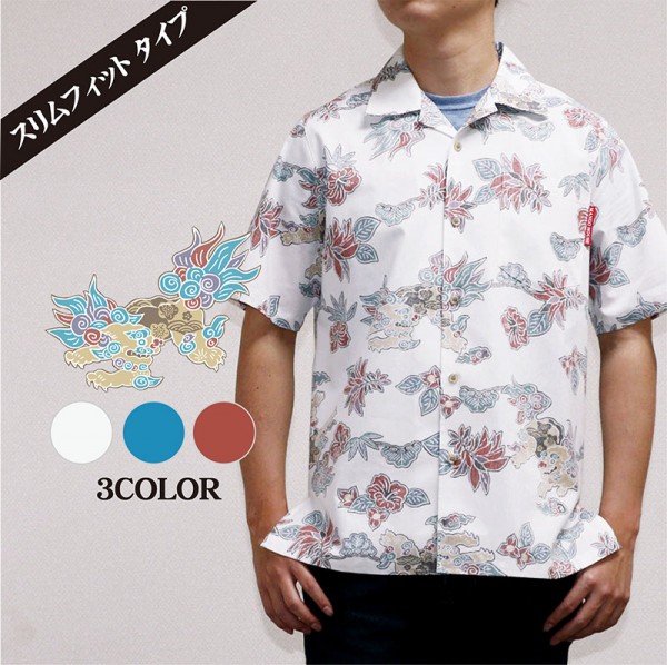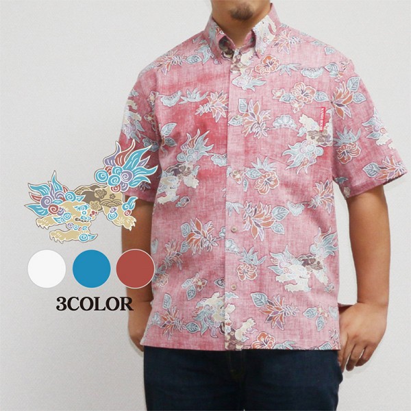 沖縄の伝統工芸、「紅型」をカジュアルにアレンジ!花の中を駆け回るシーサーを愛らしく表現した、沖縄らしさ抜群!着心地満点のアロハシャツ(かりゆしウェア)。