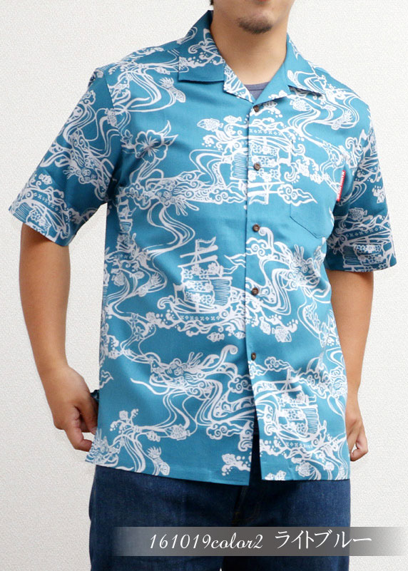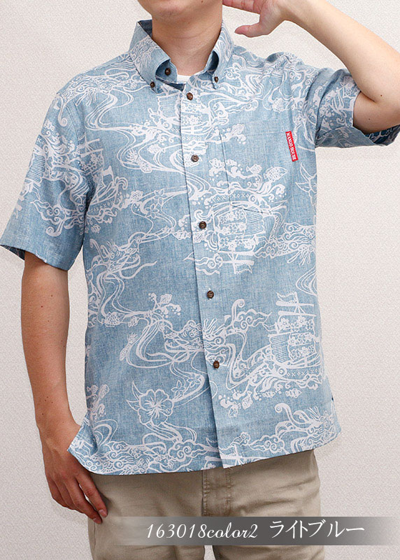 アロハシャツ-かりゆしウェア【ドラゴン進貢船(開襟シャツ) メンズ ライトブルー】アロハシャツ-かりゆしウェア【ドラゴン進貢船(スリムフィット/ボタンダウンシャツ)裏地仕様 メンズ ライトブルー】