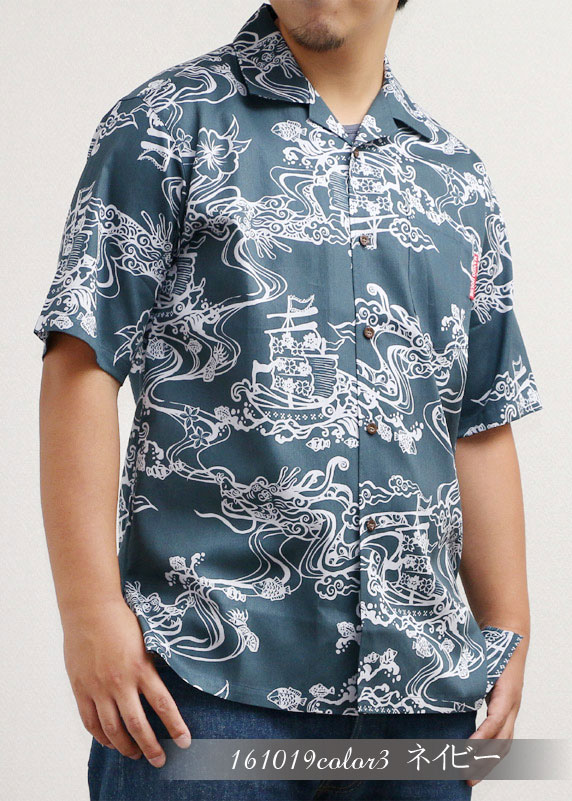 アロハシャツ-かりゆしウェア【ドラゴン進貢船(開襟シャツ) メンズ大きいサイズ】