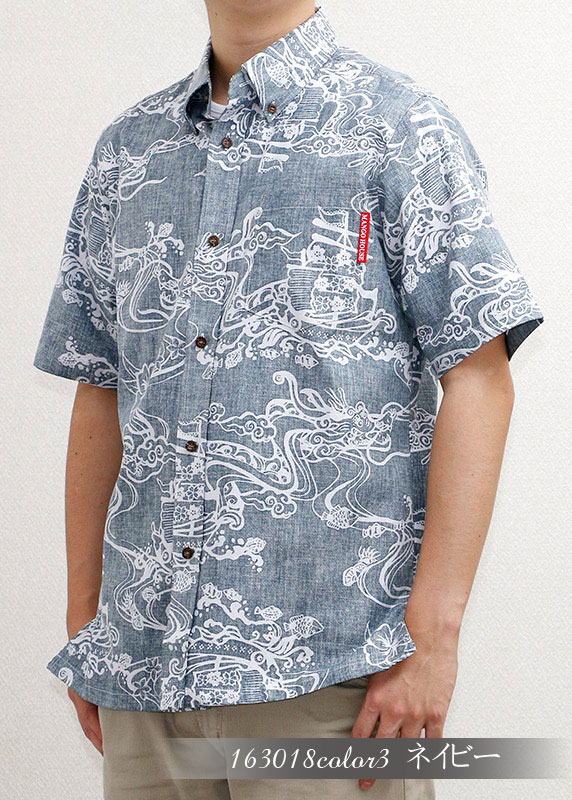 アロハシャツ-かりゆしウェア【ドラゴン進貢船(開襟シャツ) メンズ ネイビー】アロハシャツ-かりゆしウェア【ドラゴン進貢船(スリムフィット/ボタンダウンシャツ)裏地仕様 メンズ ネイビー】