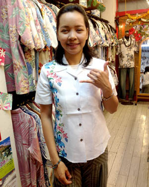 シャツは縦ボーダーを気に入ってくれて、選んだのがアロハシャツ-かりゆしウェア【紅型やどかりボーダー レディース】というデザイン♪涼しげなデザインでとても似合っていましたよー(^v^)/