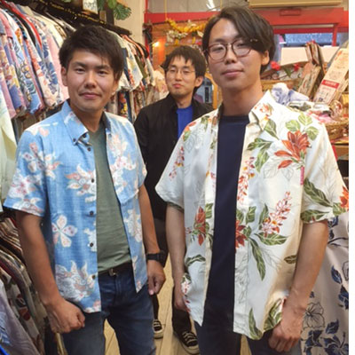 左のお兄さんが沖縄かりゆしウェア「シーサーペイズリー」