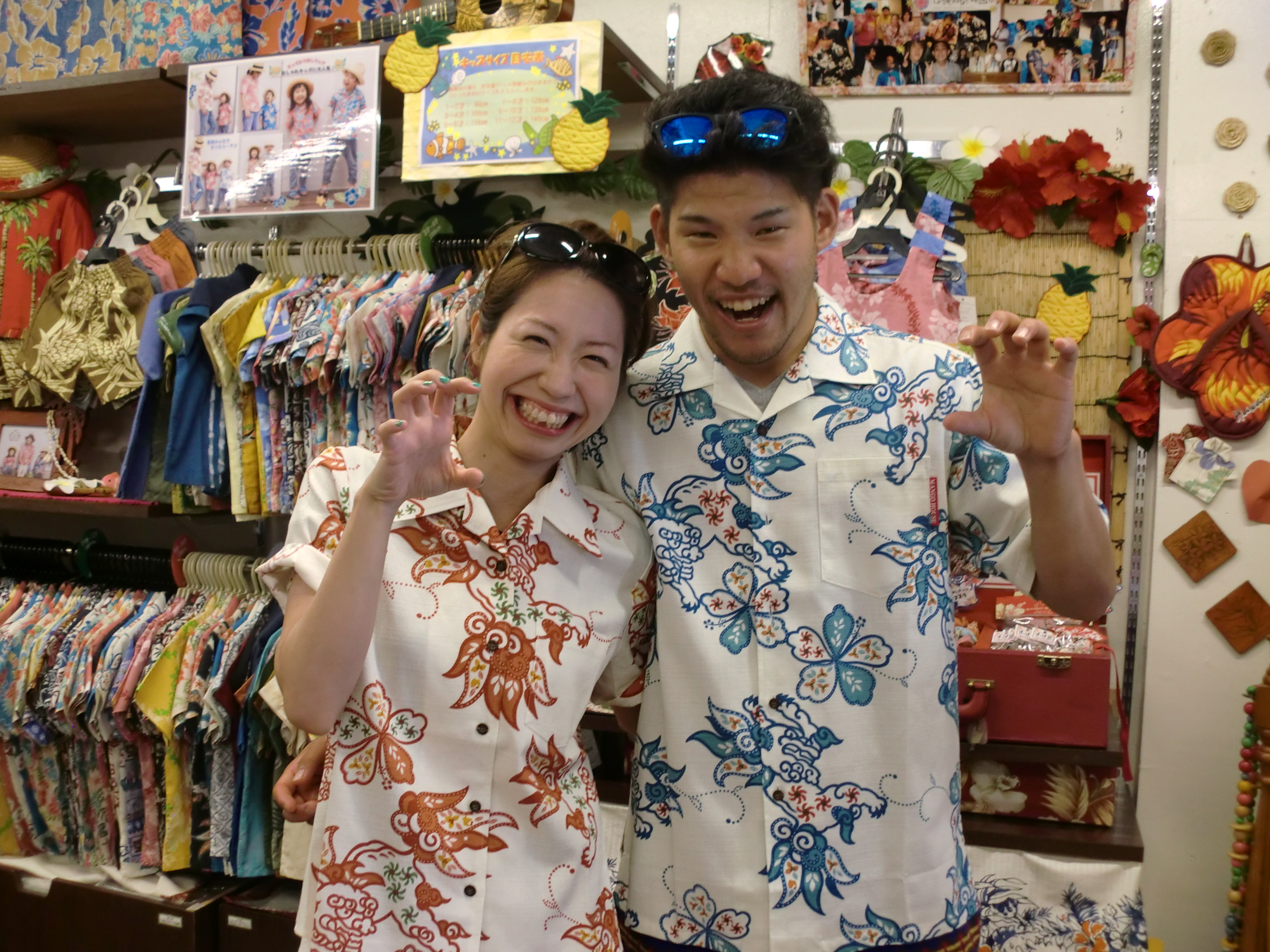 お二人が着ているかりゆしはシーサーペーズリーのオフブルーとオフレッドです!