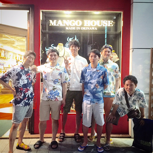 みんな揃ってかりゆしウェアを着て、マンゴハウスの前でパシャリ♪