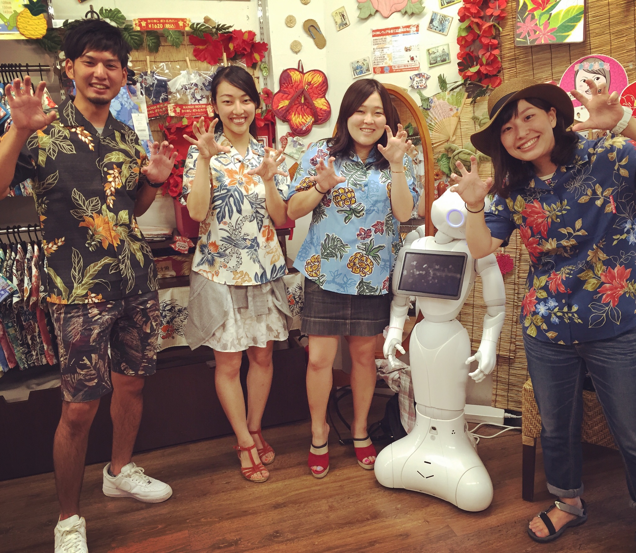右から2番目の方が着ているのはアダン総柄のライトブルー!