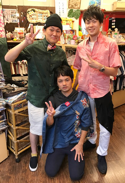 沖永伊良部島のご友人も連れて、しかも以前購入したという当店のかりゆしウェアを着ていました!