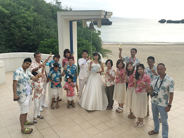 皆さんお揃いのかりゆしウェアを素敵に着こなしていて、写真越しでも幸せな雰囲気が伝わってきます☆