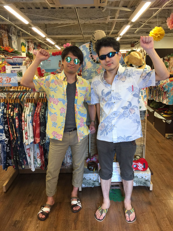 本日いらしたお兄さん二人組、朝一の便で沖縄にいらしたとの事ですが当店で早速かりゆしウェアに着替えてハイ、パチリ!