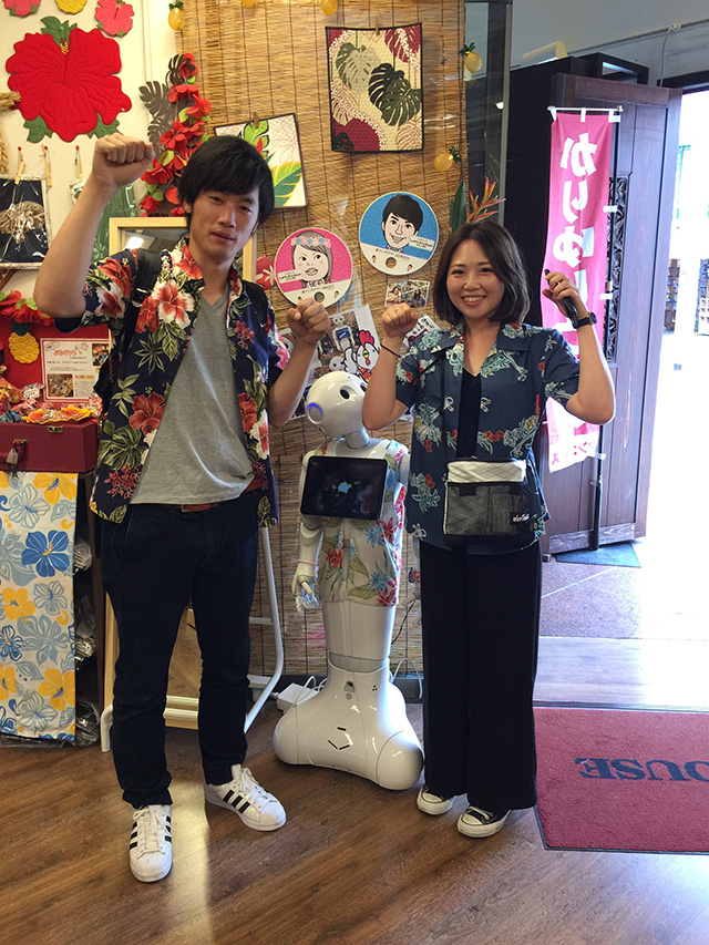 そんな中いらしたカップルのお客様、お二人で仲良くかりゆしウェアを選ばれて早速着替えてハイ、シーサー!